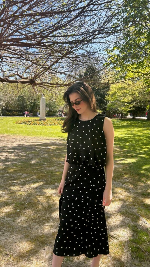 Crafted from a flowing fabric patterned with white polka dots and delicate tone-on-tone flowers, it blends lightness with refinement.