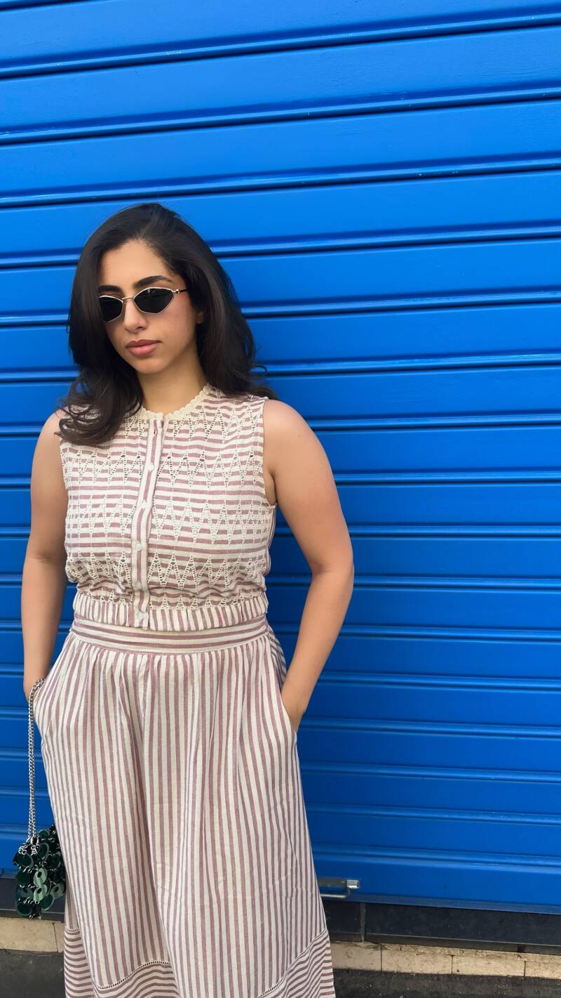 – and the Marine skirt, voluminous and navy striped — a true summer statement.