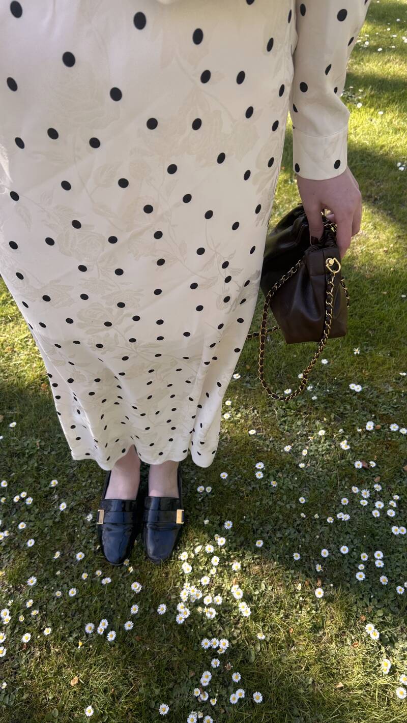 – and the Édith shirt, white with black dots, soft and sophisticated.